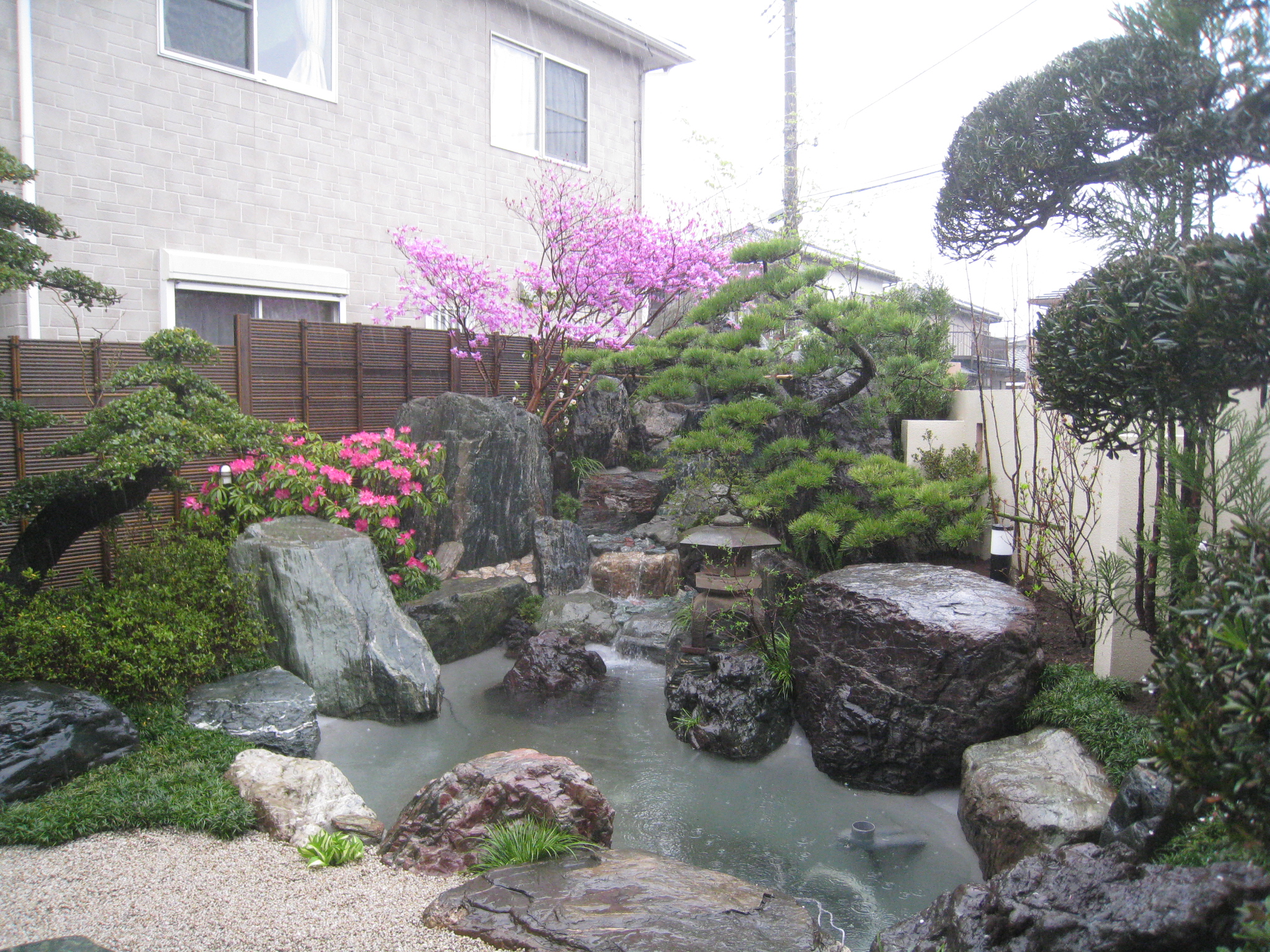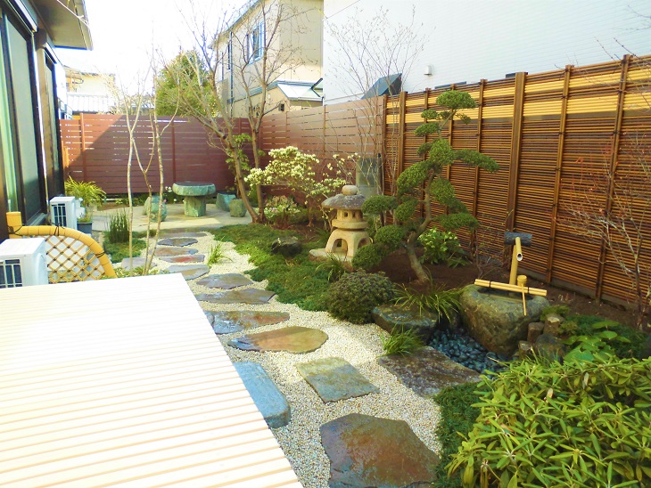 庭造り造園外構工事全般・庭石庭木の販売。池滝流れに枯山水。つくばいくつぬぎ山灯篭。レンガにブロック駐車場。フェンスに門扉にエクステリア。飛び石 砂利敷き防草対策。剪定伐採お庭の管理。